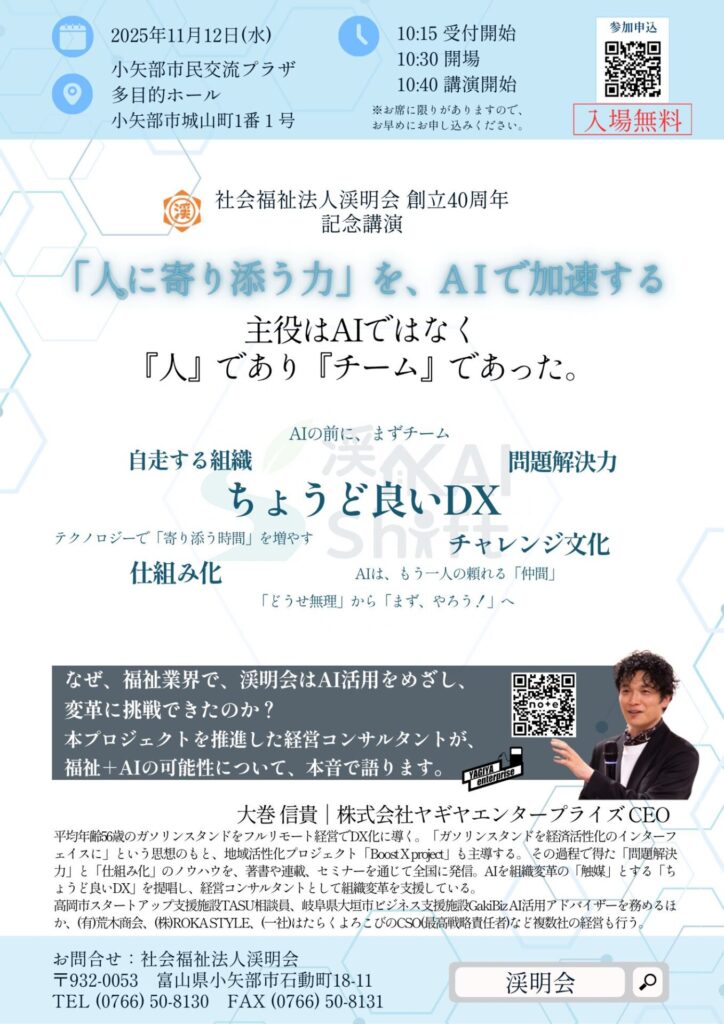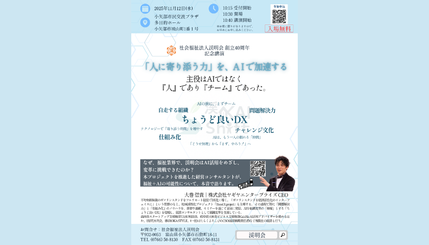 | 提供サービス | 【講演タイトル】 「人に寄り添う力を、AIで加速する」 〜主役はAIではなく「人」であり「チーム」であった〜 なぜ、福祉業界で、渓明会はAI活用をめざし、変革に挑戦できたのか? 本プロジェクトを推進した経営コンサルタントが、福祉+AIの可能性について、本音で語ります。 |