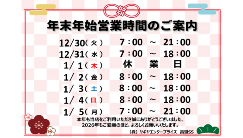 2025.12.12 高道SS [高道SS] 年末年始 「営業時間」のご案内 本年もご愛顧いただき、誠にありがとうございます。年末年始の営業時間についてご案内いたします。日によって営業時間が変わりますため、ご不便をおかけしますがご理解い…