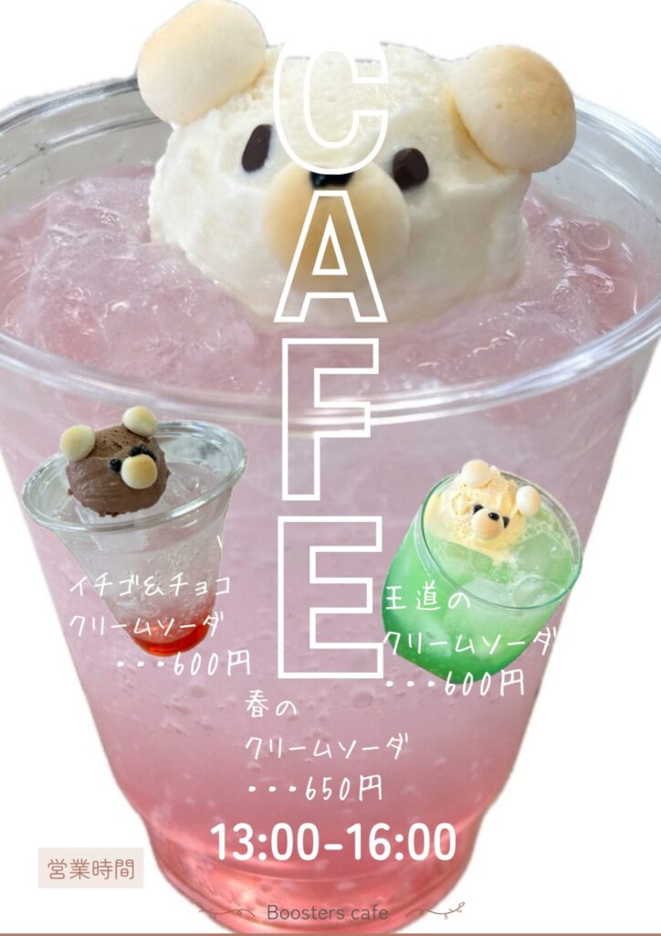 | 提供サービス | 春のクリームソーダ☺︎ 今回は、春のクリームソーダが新登場♡ ・王道のクリームソーダ…600円 ・イチゴ&チョコのクリームソーダ…600円 ・春のクリームソーダ…650円 |