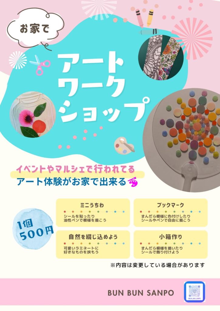 | 提供サービス | アートワークショップ(うちわ作り) シールやペンなどでオリジナルうちわを作ります ワークショップ 1点 500円 体験キット 1点 500円 |