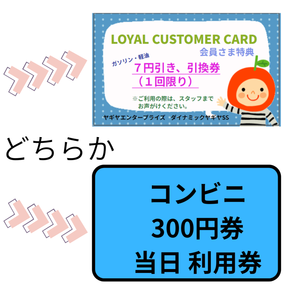 ◦洗車券は9月30日で終了し代替としてガソリン・軽油が1Lあたり7円引きになる割引引換券に変更。