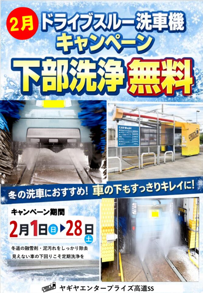 [高道SS] 【2月末まで】ドライブスルー洗車 下部洗浄無料キャンペーン