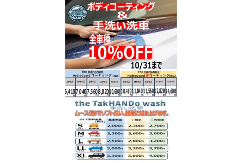 2025.10.03 高道SS [高道SS] 「 the TakHANDo ボディコーティング&手洗い洗車」キャンペーン開催中!(10/31まで) [the TakHANDo coating] コーティング または極(きわみ)コーティング、手洗い洗車を全車種10%OFFで承ります!(下記画像の価…